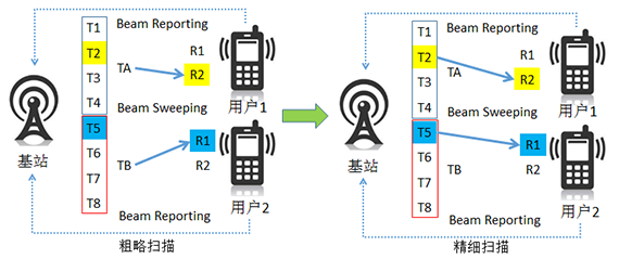由于5G天線使用大規(guī)模天線陣列系統(tǒng),當(dāng)波束成形以后,為保證用戶接收信號(hào)最佳,基站需要精確定位用戶,并確保天線波束對(duì)準(zhǔn)用戶。此時(shí)基站將發(fā)射不同方向波束,當(dāng)用戶接收端接收到不同波束后將相關(guān)信息報(bào)告給基站,以便尋找到用戶接收到的最佳指向波束,精確匹配最佳指向波束的整個(gè)過程稱為波束掃描(Beam Sweeping)。