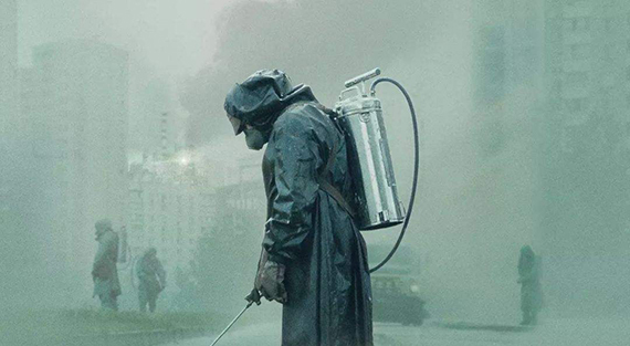 為了表現(xiàn)核輻射的巨大破壞力,導(dǎo)演除了展現(xiàn)它所帶來的人道災(zāi)難、生態(tài)災(zāi)難和人文災(zāi)難外,還用了較大的篇幅描述了清除核輻射的高難度和核災(zāi)難陰影的揮之不去。第一次爆炸后,極有可能引發(fā)第二次爆炸,而第二次爆炸將直接摧毀明斯克,歐洲將無法住人,前蘇聯(lián)出動(dòng)空軍空投了24000噸鉛給反應(yīng)堆降溫,征招了一萬名礦工超負(fù)荷工作一個(gè)多月,打隧洞通到核反應(yīng)堆下方安置降溫設(shè)施;為了給作為放射源的電站加蓋石棺,前蘇聯(lián)出動(dòng)了3500名后備軍清理電站屋頂?shù)姆派湫允?b>這些士兵穿著厚重的鉛制服裝,只能在屋頂待四十五秒,鏟兩鏟就得下樓,每隔10分鐘就要換班一次。在核電站作業(yè)的礦工和士兵,每分每秒都暴露在高劑量的致命輻射中,死神在耳邊低語,恐懼無處不在,其后2500名礦工在40歲之前死去,軍方?jīng)]有公布軍人的傷亡數(shù)字,而隨行的攝影記者每年要在醫(yī)院待兩個(gè)月進(jìn)行治療。