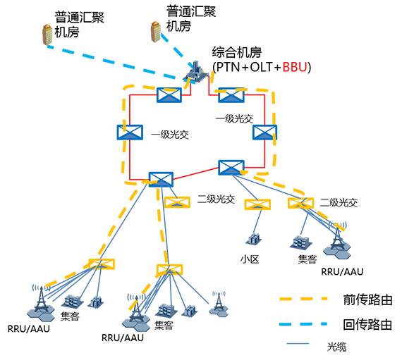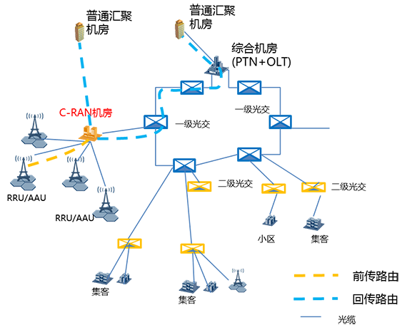 CRAN機房與OLT機房不重合,原有基站光纜網能滿足前傳需求。可利用原有基站光纜網作前傳,回傳可利用綜合業務區光纜。如下圖: